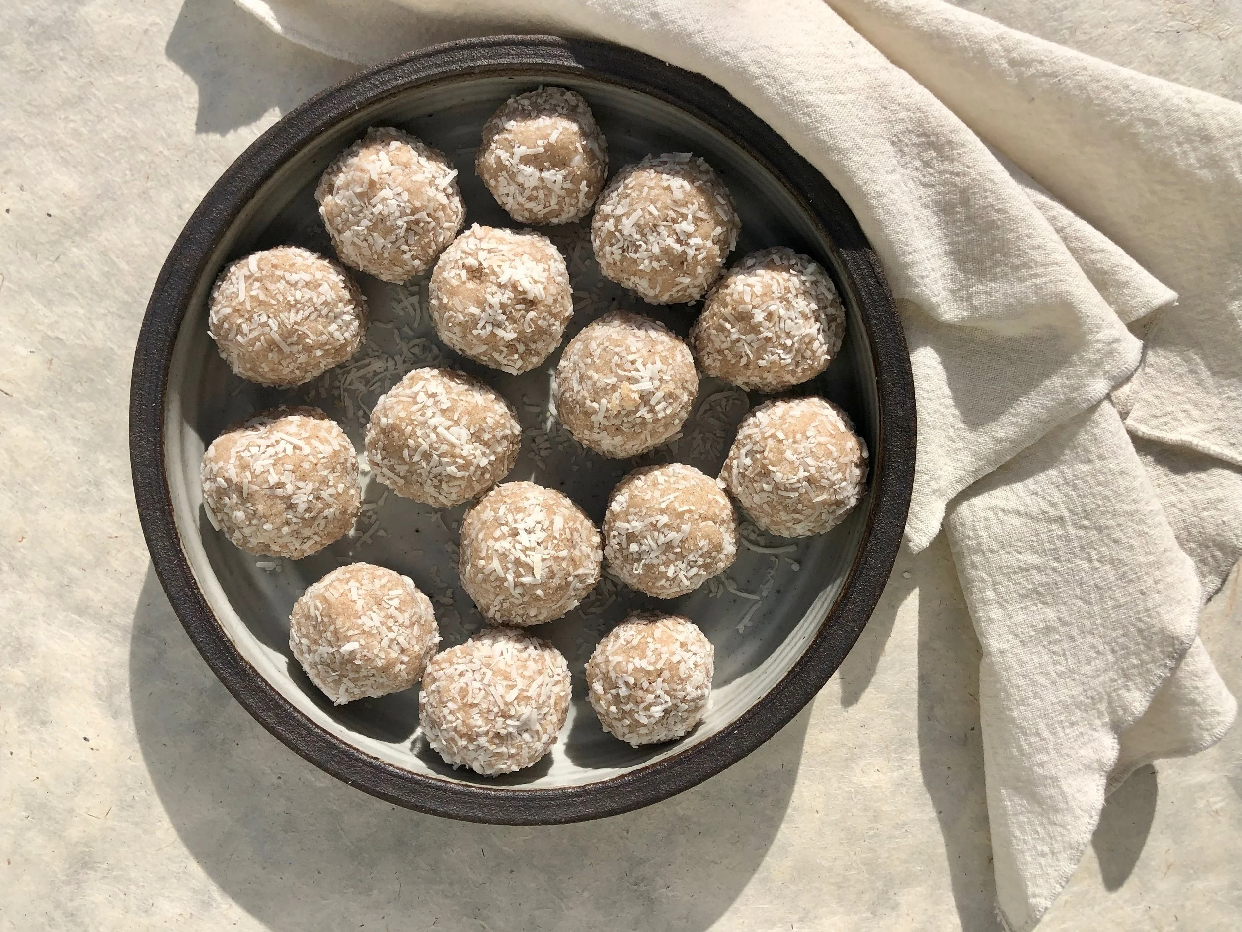 Remove dough from the food processor, and refrigerate for about 10-15 minutes just so the dough is firm enough to roll into balls. Using approximately 2 tbsp per serving, roll into balls. You can roll them in coconut flakes for an optional garnish.